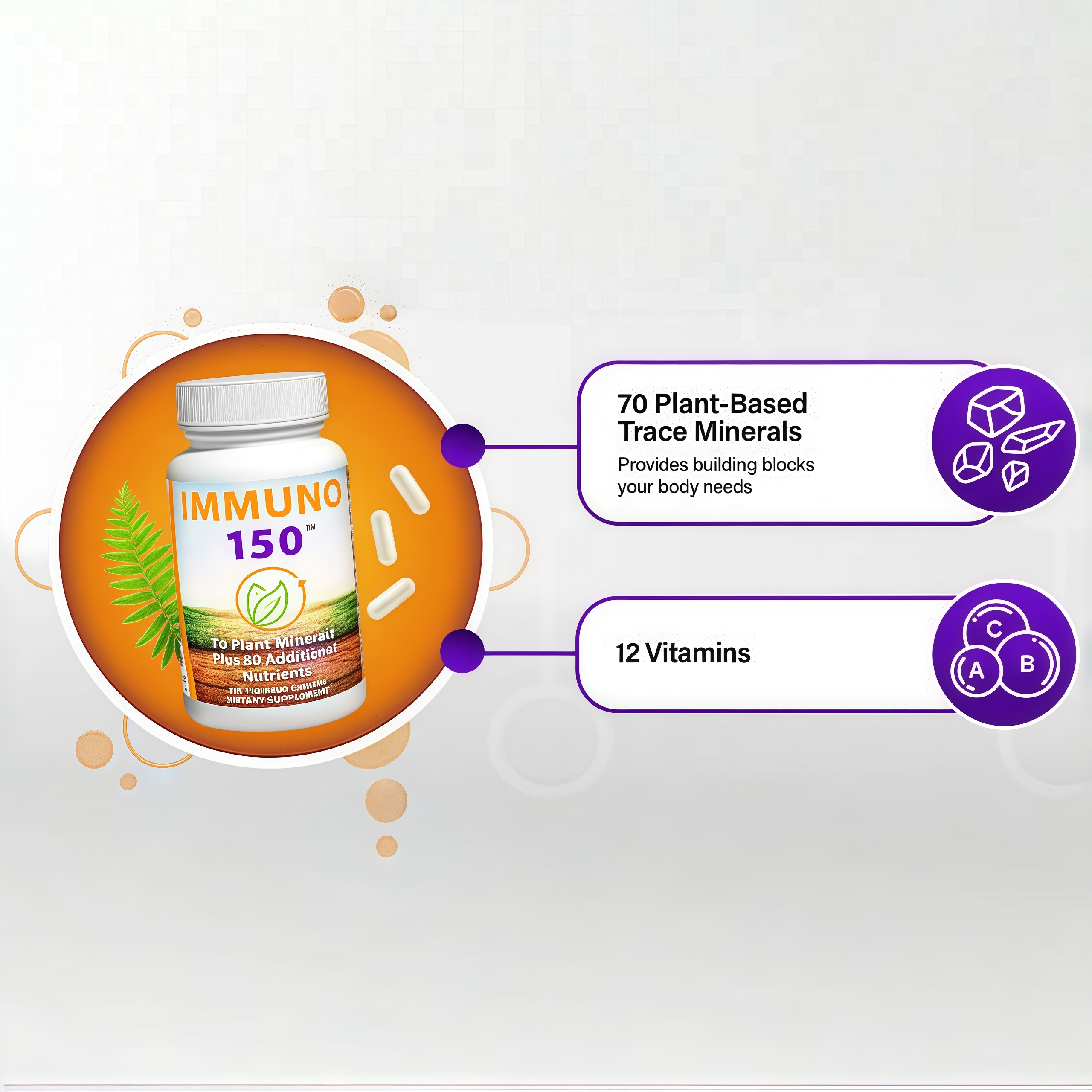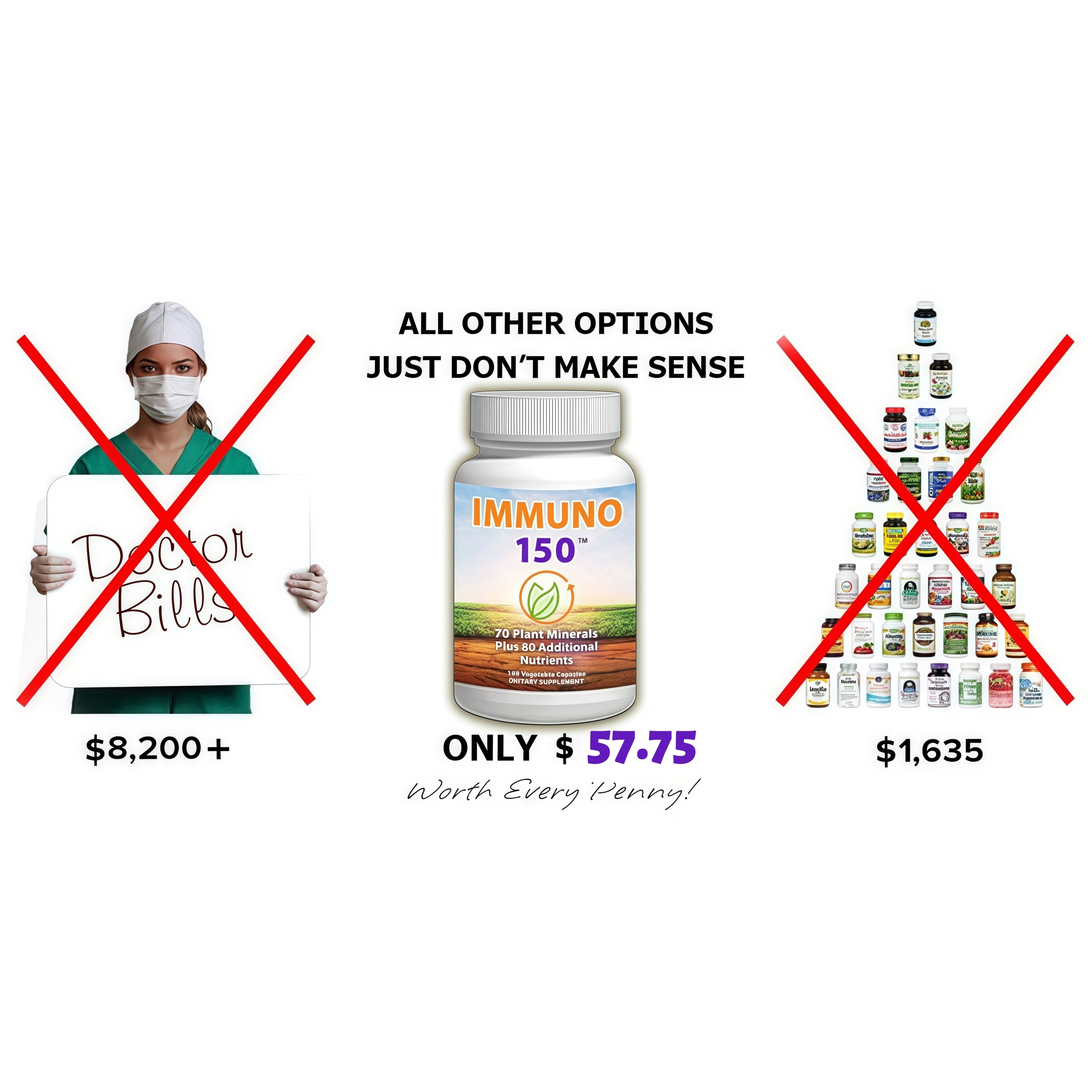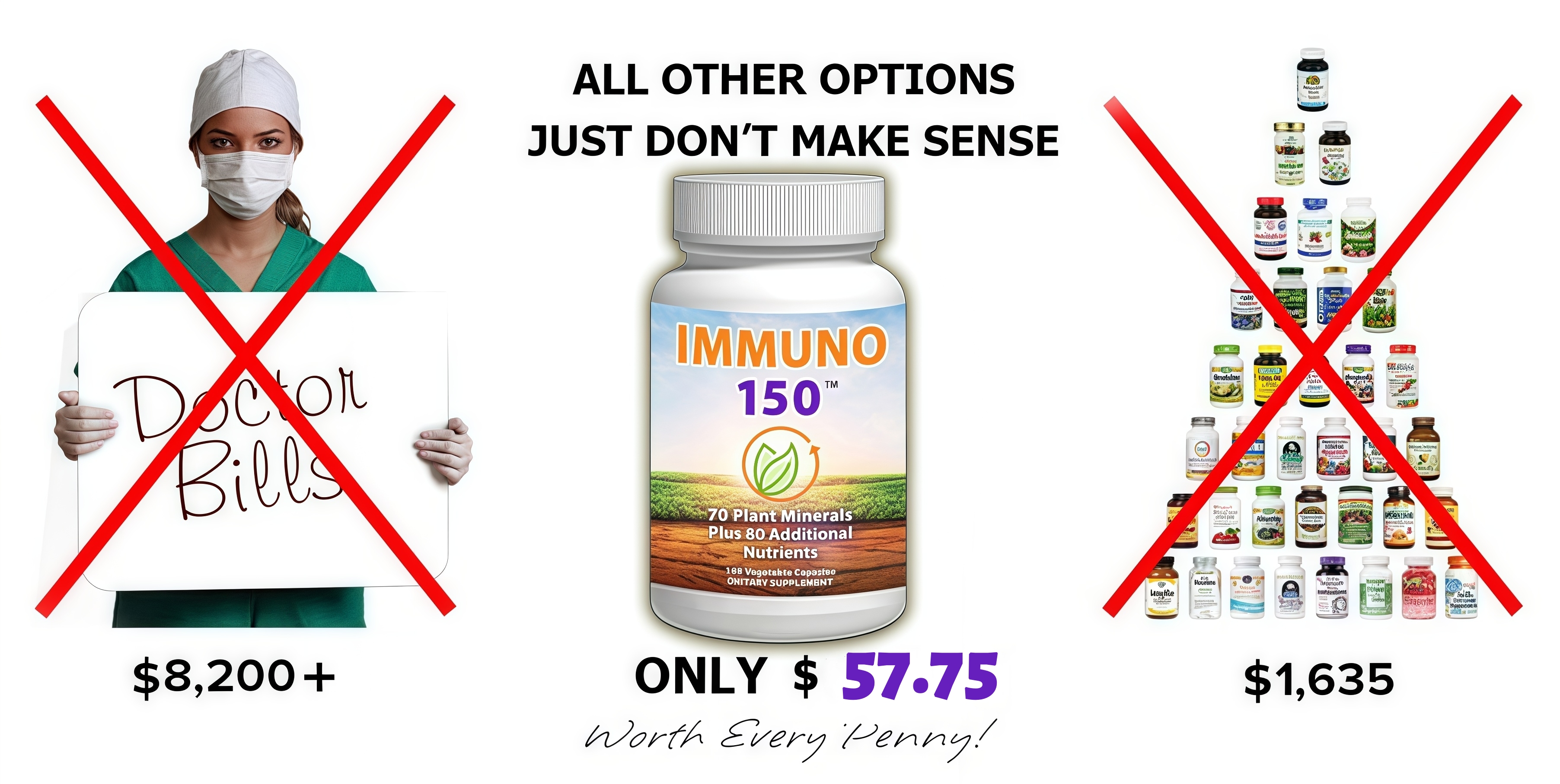Here we are, whirling around the Sun and riding through the universe on a planet that not only sustains life but also allows humans to thrive. But, are we taking full advantage of what has been offered to us? Our average age is 78! With our experience in this business, we are of the belief our average age could be well into the 90s if everyone had daily access to a vast array of easily digested Plant minerals. Subpar immune systems contribute to weakness, instability, sickness, disease, and unnecessary pain.IMMUNO 150 was formulated to strengthen immune systems and correct many abnormalitiesand has a track record of being the first over the finish line in that area.Its 70 plant-derived colloidal minerals are the key to its success.This full spectrum of hydrophilic minerals has been blended and synchronized with 80 superb nutrients to produce one of the finest nutritional supplements in the world.Prove it to yourself by comparing the supplement facts and number of minerals in IMMUNO 150 to any other nutritional product.